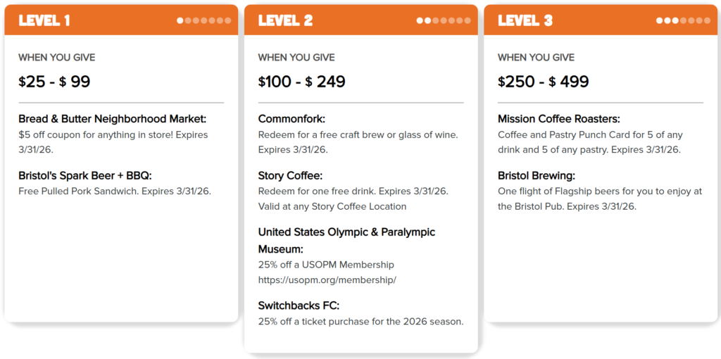 During the Give Campaign, we partner with local businesses to provide perks to donors. Reward Partners agree to offer a discount, gift, or service to a donor depending on what level of donation they make. Being a Reward Partner is an effective way for local businesses to give back to our community, support local nonprofits, and let the public know you are a philanthropic and community-minded business. Check out examples from the 2025 campaign below. Have questions? Let us know! We’d love to get creative on how your business can get involved. We can also give you an idea of how many perks are redeemed each year.